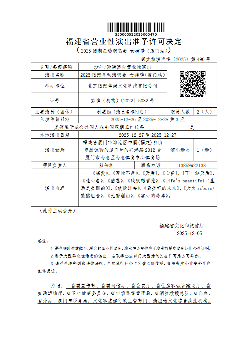 - 内容概述: 福建省营业性演出准予许可决定 (2025国潮星动演唱会-女神季(厦门站))