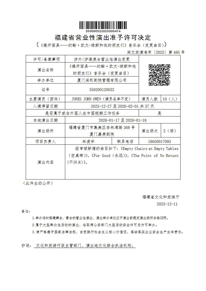 福建省营业性演出准予许可决定(《揭开面具——约翰·欧文-琼斯和他的朋友们》音乐会(变更曲目))