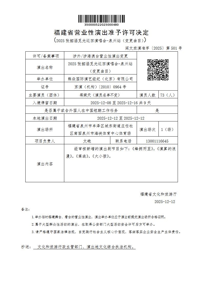 - 文 号: 闽文旅演准字〔2025〕第501号