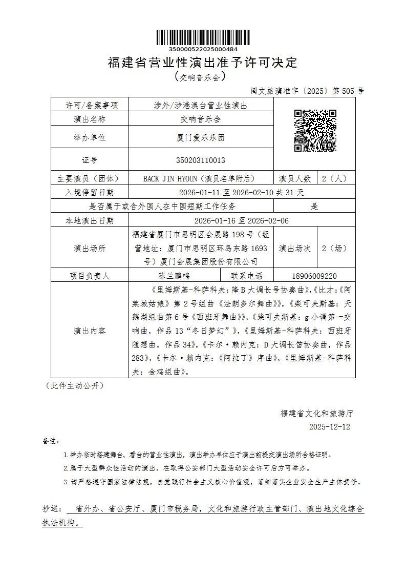 - 内容概述: 福建省营业性演出准予许可决定(交响音乐会)
