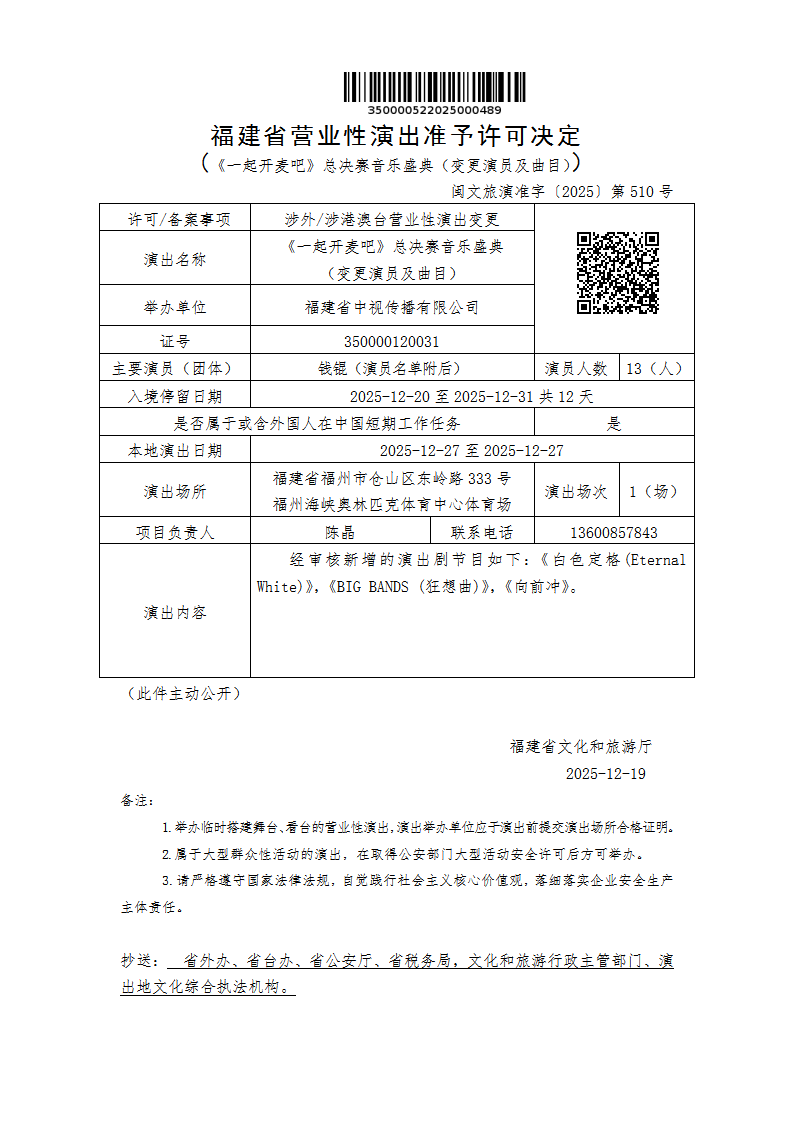 福建省营业性演出准予许可决定(《一起开麦吧》总决赛音乐盛典(变更演员及曲目))