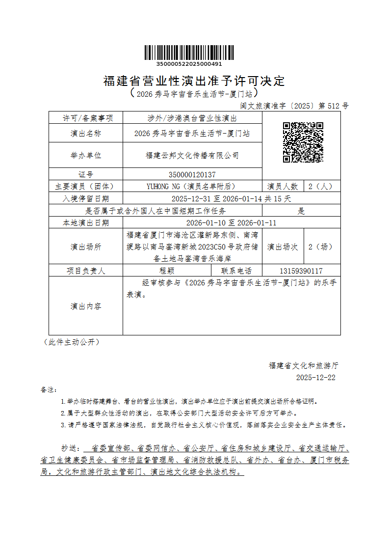 福建省营业性演出准予许可决定(2026秀马宇宙音乐生活节-厦门站)