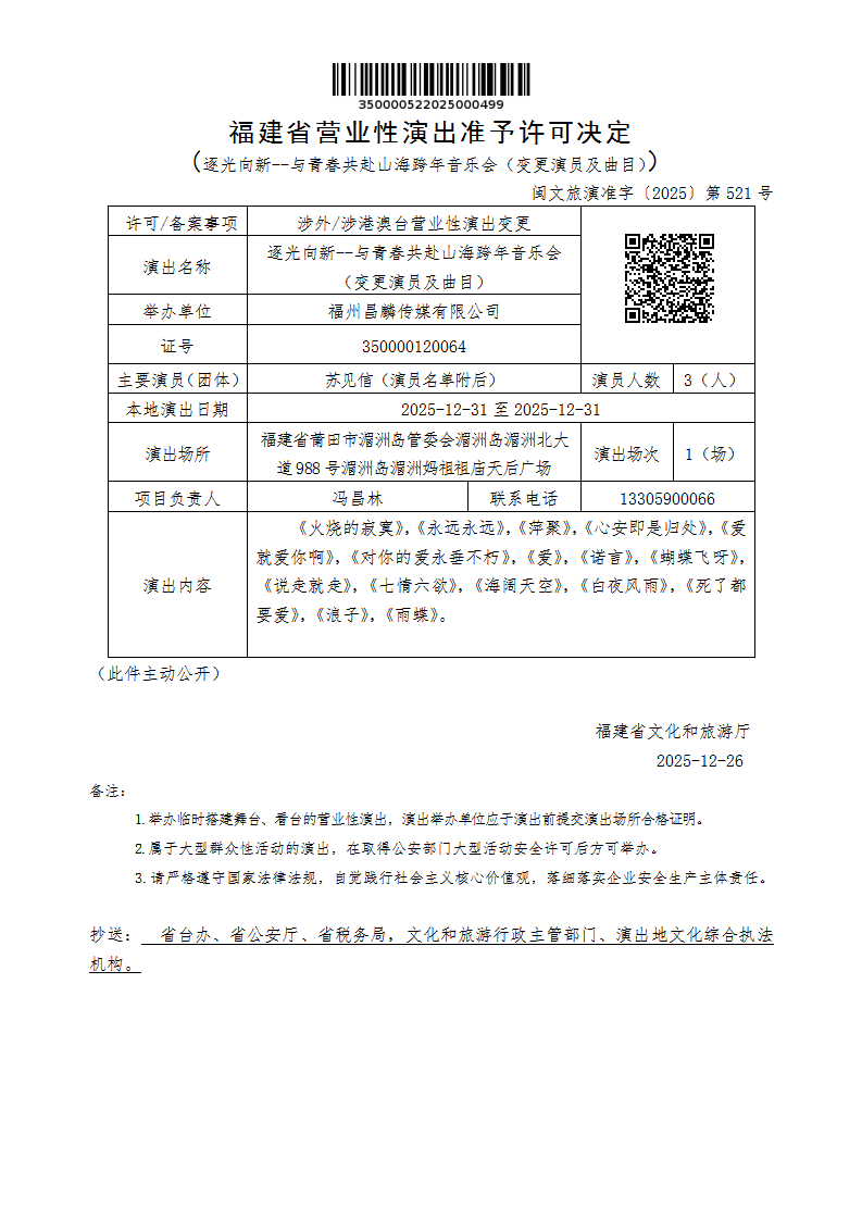 福建省营业性演出准予许可决定(逐光向新--与青春共赴山海跨年音乐会(变更演员及曲目))