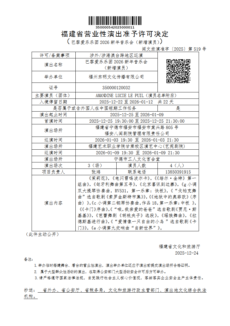 福建省营业性演出准予许可决定(巴黎爱乐乐团2026新年音乐会(新增演员))
