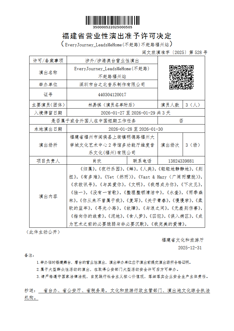 福建省营业性演出准予许可决定(EveryJourney_LeadsMeHome(不赶路)不赶路福州站)