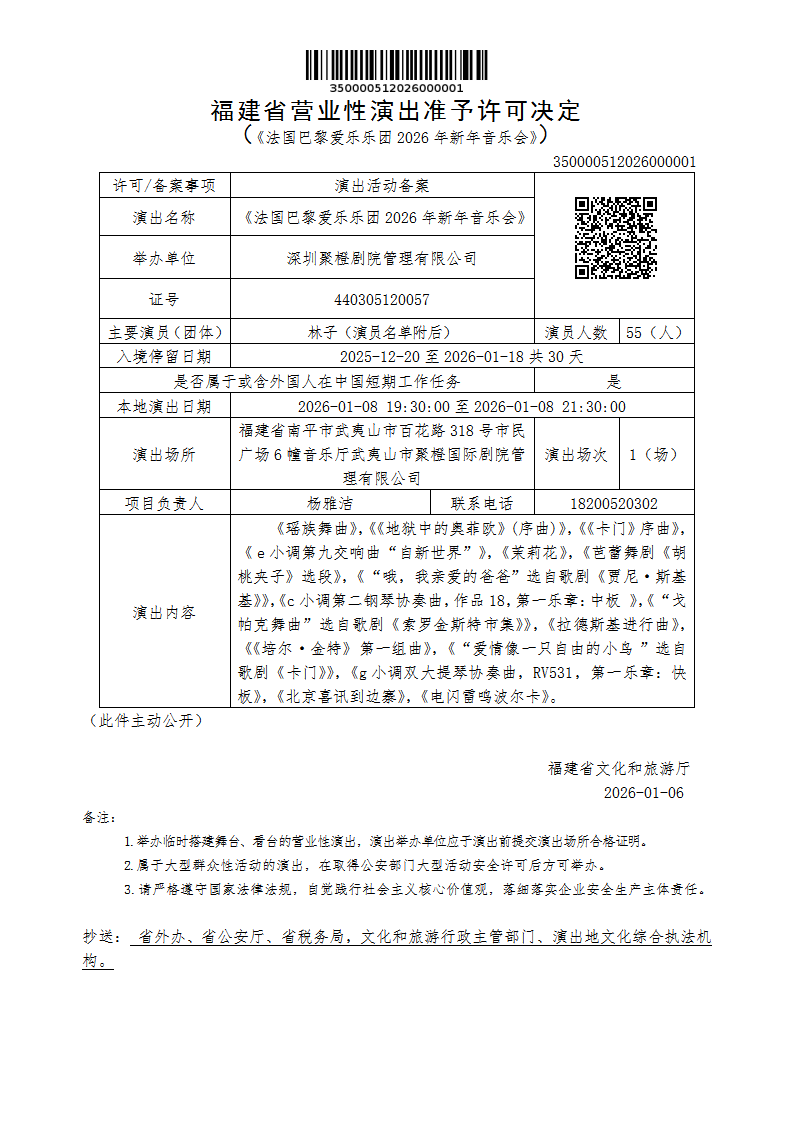 福建省营业性演出准予许可决定(《法国巴黎爱乐乐团2026年新年音乐会》)