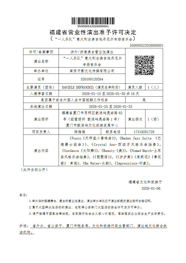 - 内容概述: 福建省营业性演出准予许可决定(“一人乐队”意大利古典吉他丹尼尔专场音乐会)