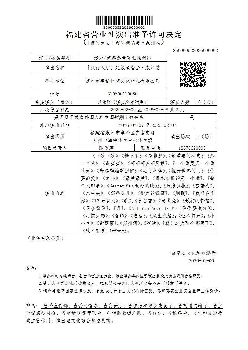 - 内容概述: 福建省营业性演出准予许可决定(「流行天后」超级演唱会·泉州站)