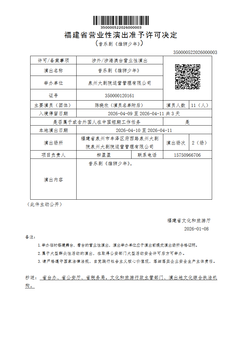 福建省营业性演出准予许可决定(音乐剧《雄狮少年》)