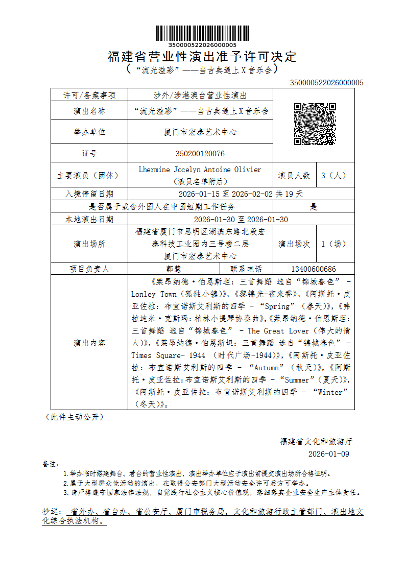 福建省营业性演出准予许可决定(“流光溢彩”——当古典遇上X音乐会)