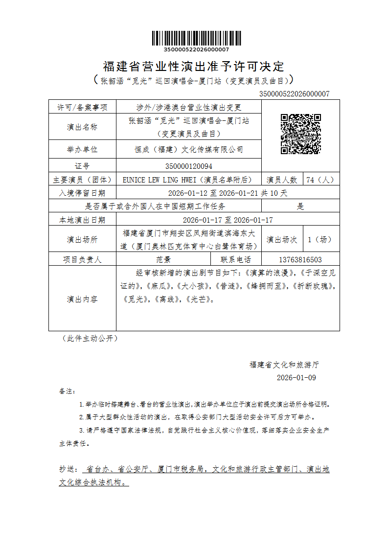 福建省营业性演出准予许可决定(张韶涵“觅光”巡回演唱会-厦门站(变更演员及曲目))