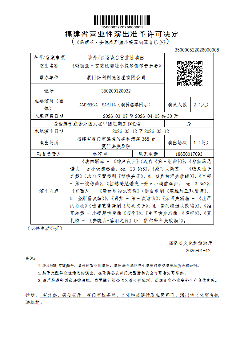 - 内容概述: 福建省营业性演出准予许可决定(《玛丽亚·安德烈耶娃小提琴钢琴音乐会》)
