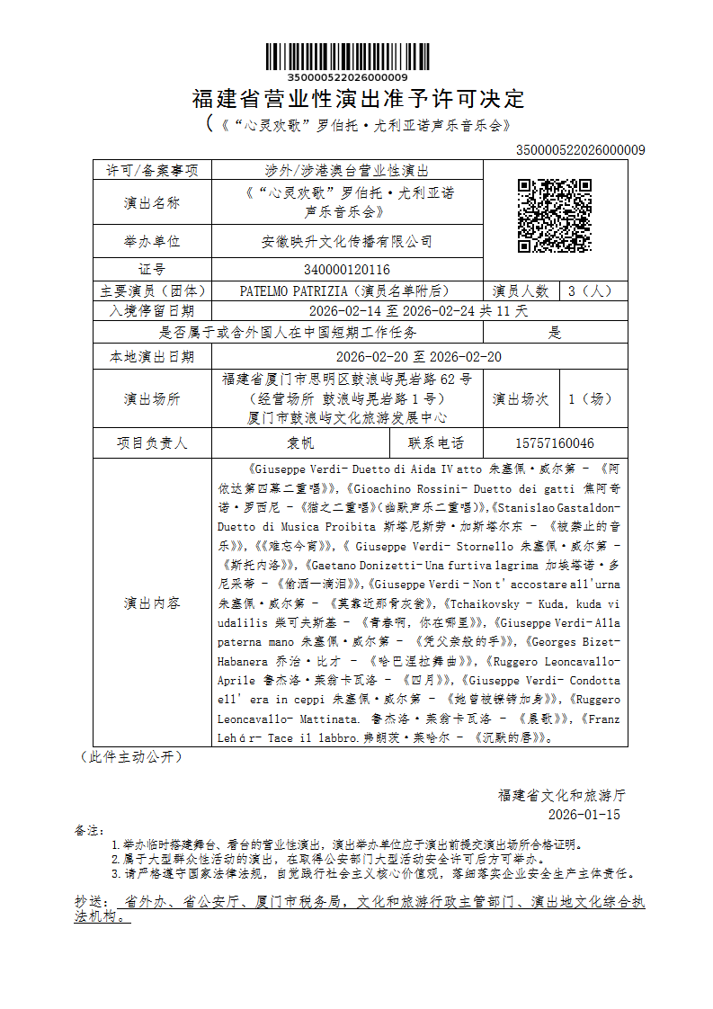 福建省营业性演出准予许可决定(《“心灵欢歌”罗伯托·尤利亚诺声乐音乐会》