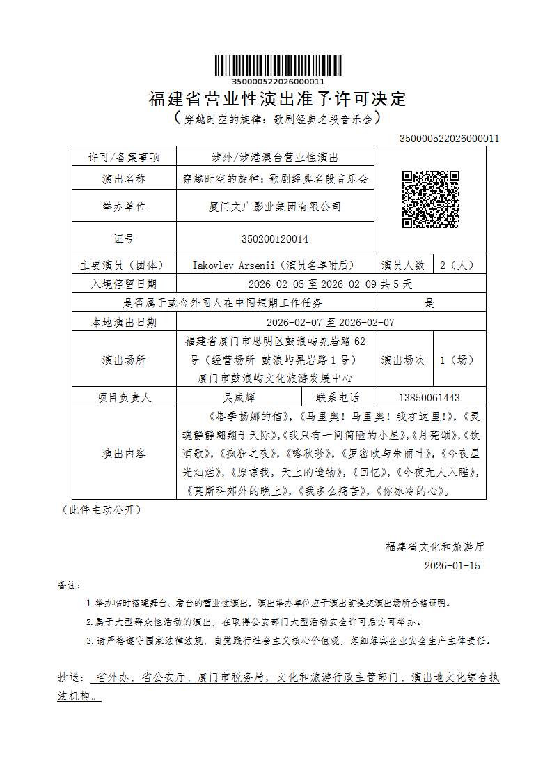 福建省营业性演出准予许可决定(穿越时空的旋律:歌剧经典名段音乐会)