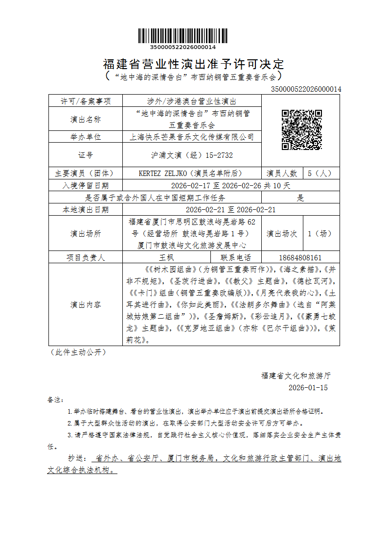 福建省营业性演出准予许可决定(“地中海的深情告白”布西纳铜管五重奏音乐会)