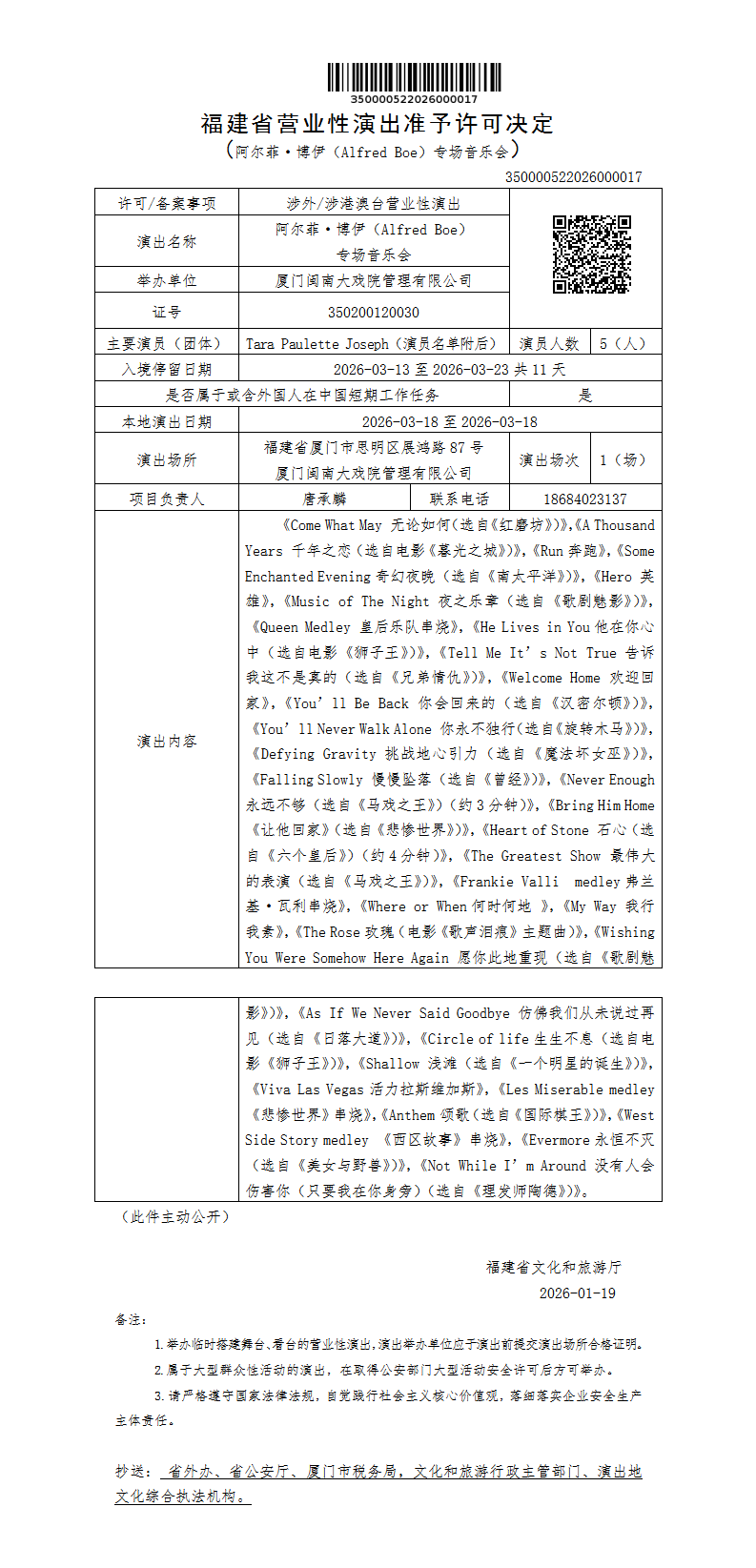 - 内容概述: 福建省营业性演出准予许可决定(阿尔菲·博伊(Alfred Boe)专场音乐会)