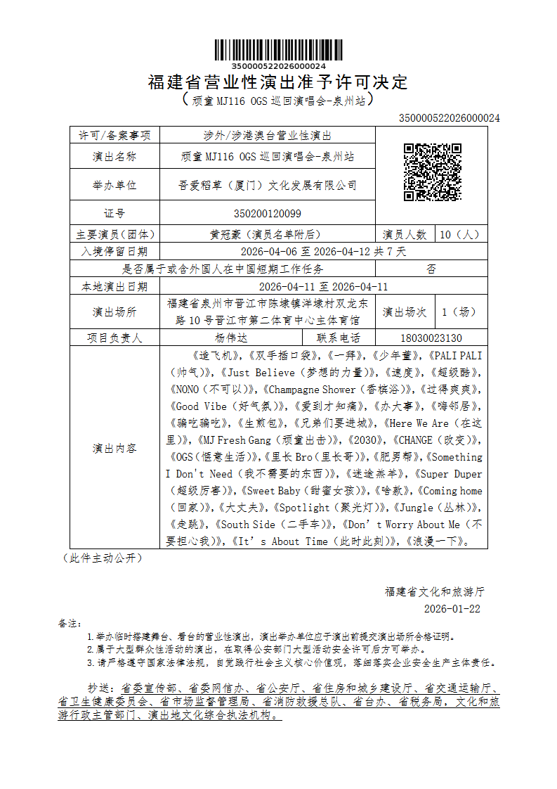福建省营业性演出准予许可决定(顽童MJ116 OGS巡回演唱会-泉州站)