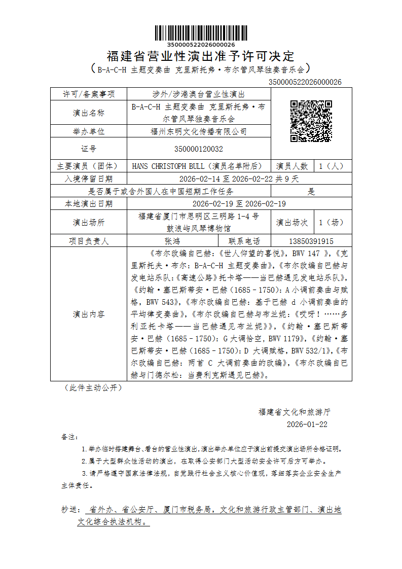 福建省营业性演出准予许可决定(B-A-C-H 主题变奏曲 克里斯托弗·布尔管风琴独奏音乐会)