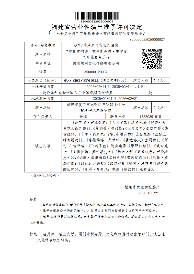 福建省营业性演出准予许可决定(“电影交响诗”克里斯托弗·布尔管风琴独奏音乐会)