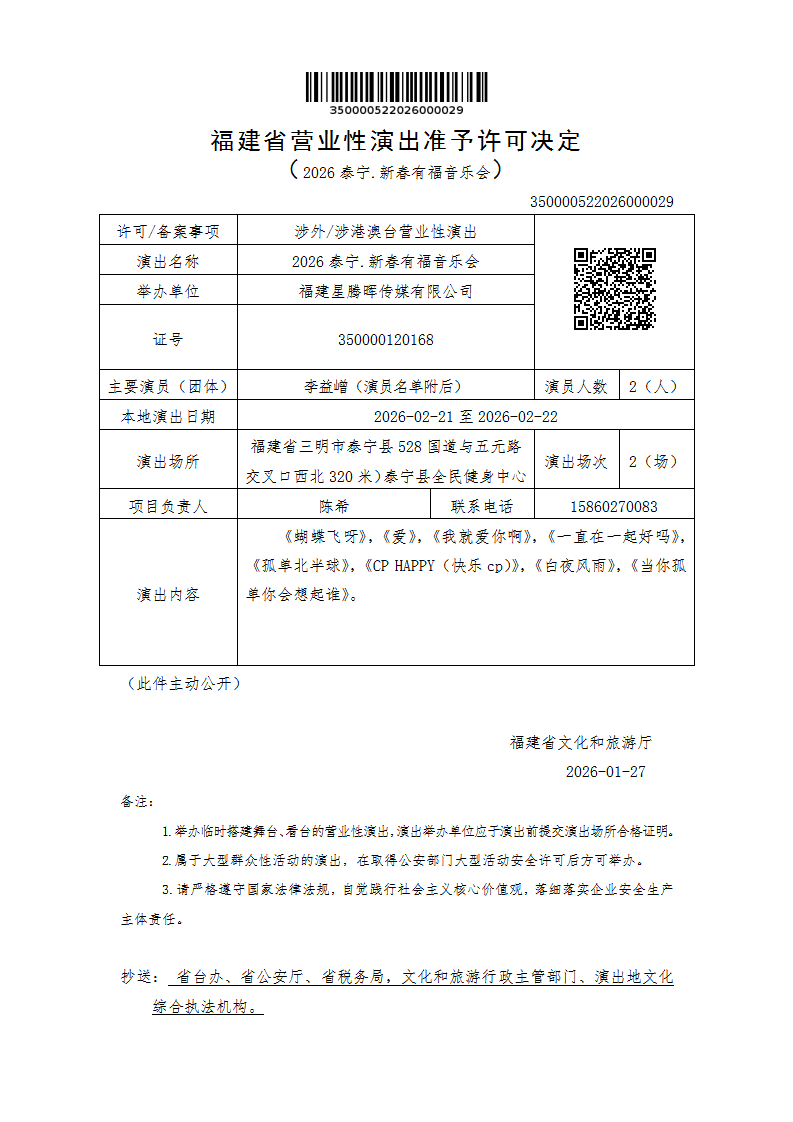 - 内容概述: 福建省营业性演出准予许可决定(2026泰宁.新春有福音乐会)