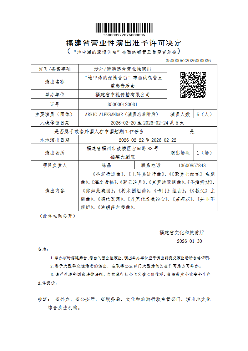 福建省营业性演出准予许可决定(“地中海的深情告白”布西纳钢管五重奏音乐会)