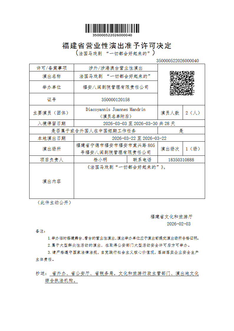 福建省营业性演出准予许可决定(法国马戏剧 “一切都会好起来的”)