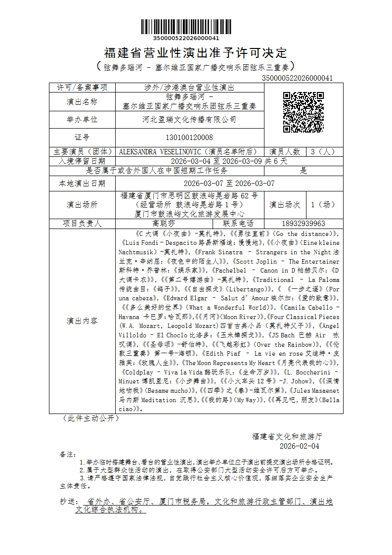 福建省营业性演出准予许可决定(弦舞多瑙河 - 塞尔维亚国家广播交响乐团弦乐三重奏)