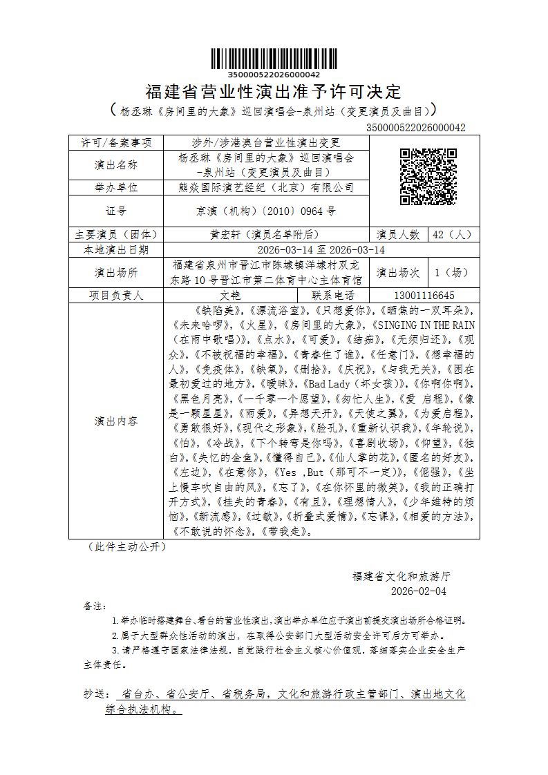 福建省营业性演出准予许可决定(杨丞琳《房间里的大象》巡回演唱会-泉州站(变更演员及曲目))
