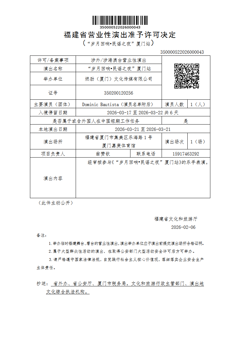 福建省营业性演出准予许可决定(“岁月回响•民谣之夜”厦门站)