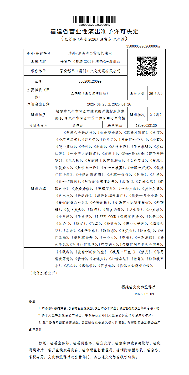 福建省营业性演出准予许可决定(任贤齐《齐迹2026》演唱会-泉州站)