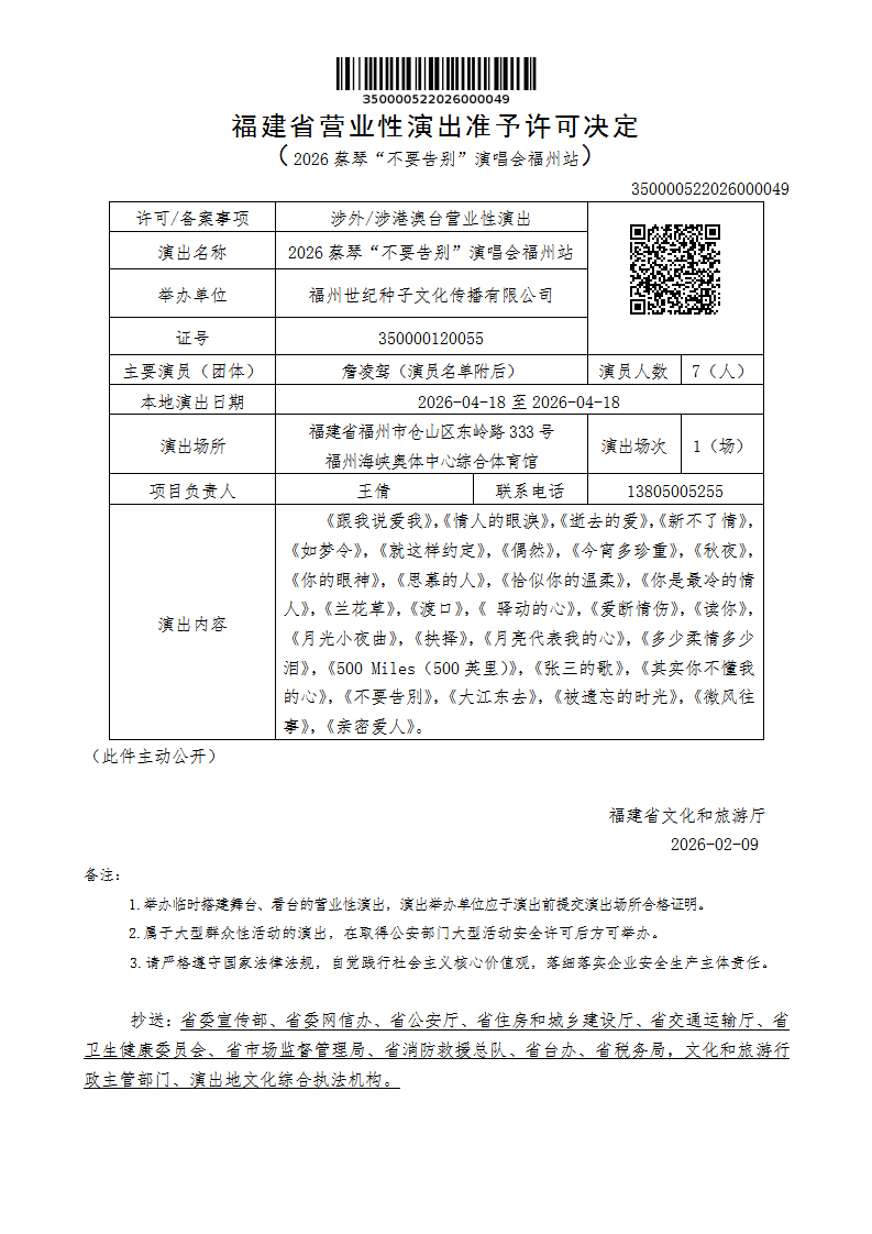 福建省营业性演出准予许可决定(2026蔡琴“不要告别”演唱会福州站)