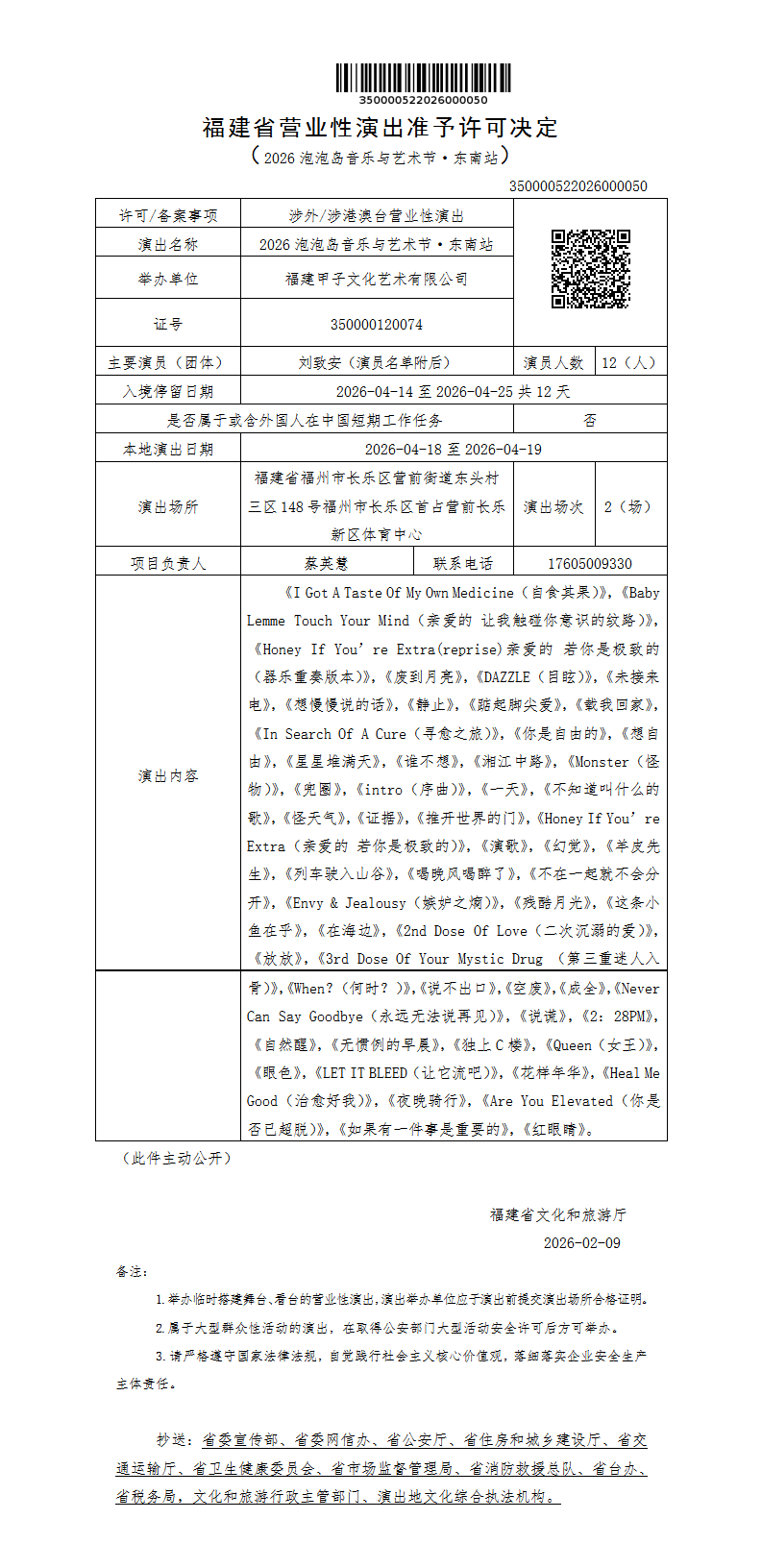 福建省营业性演出准予许可决定(2026泡泡岛音乐与艺术节·东南站)