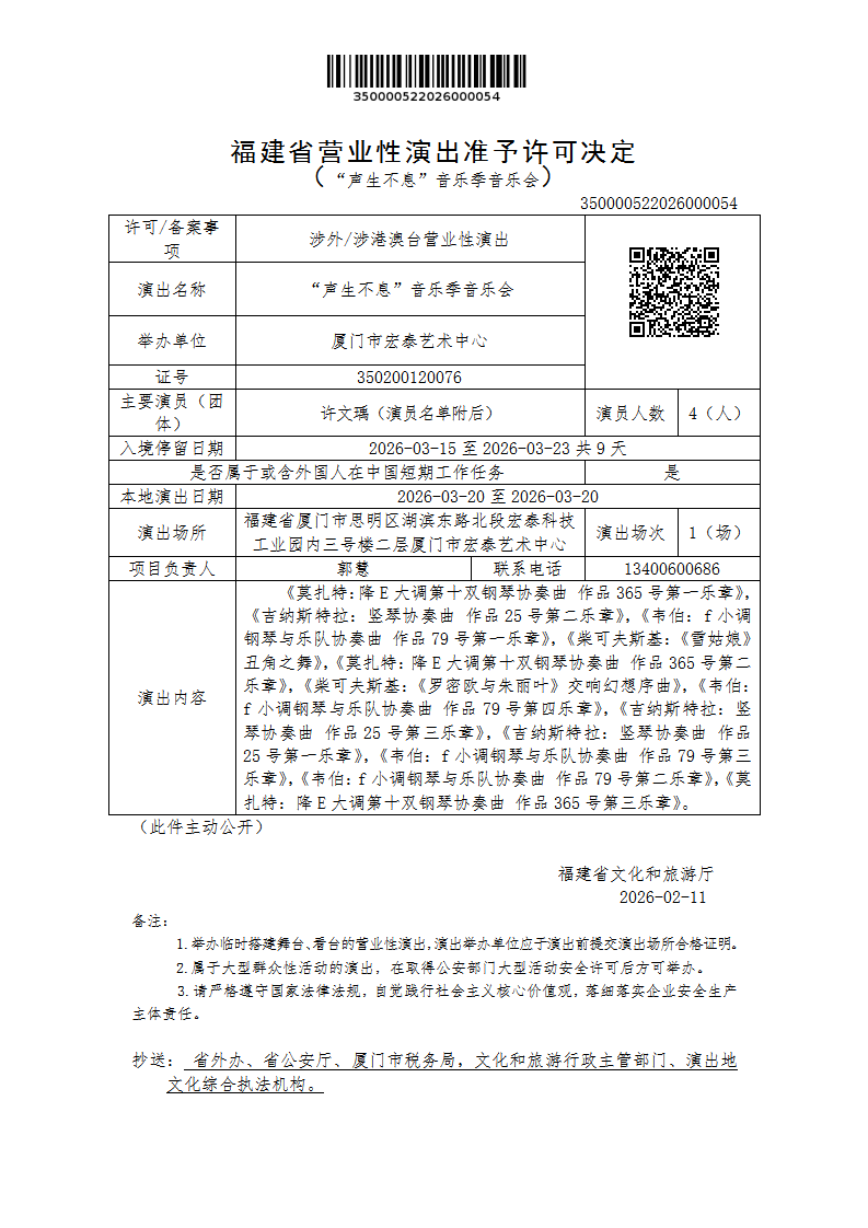 福建省营业性演出准予许可决定(“声生不息”音乐季音乐会)