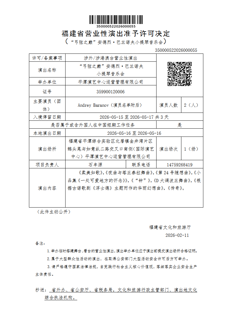 福建省营业性演出准予许可决定(“弓弦之巅”安德烈·巴兰诺夫小提琴音乐会)