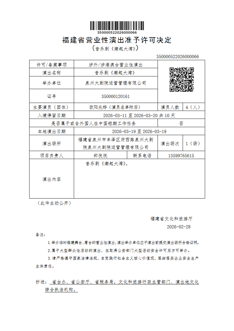 福建省营业性演出准予许可决定(音乐剧《潮起大湾》)