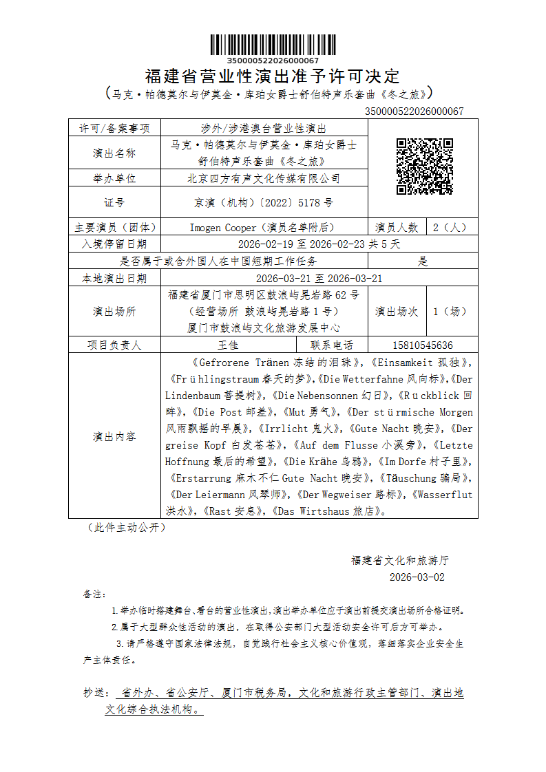 福建省营业性演出准予许可决定(马克·帕德莫尔与伊莫金·库珀女爵士舒伯特声乐套曲《冬之旅》)