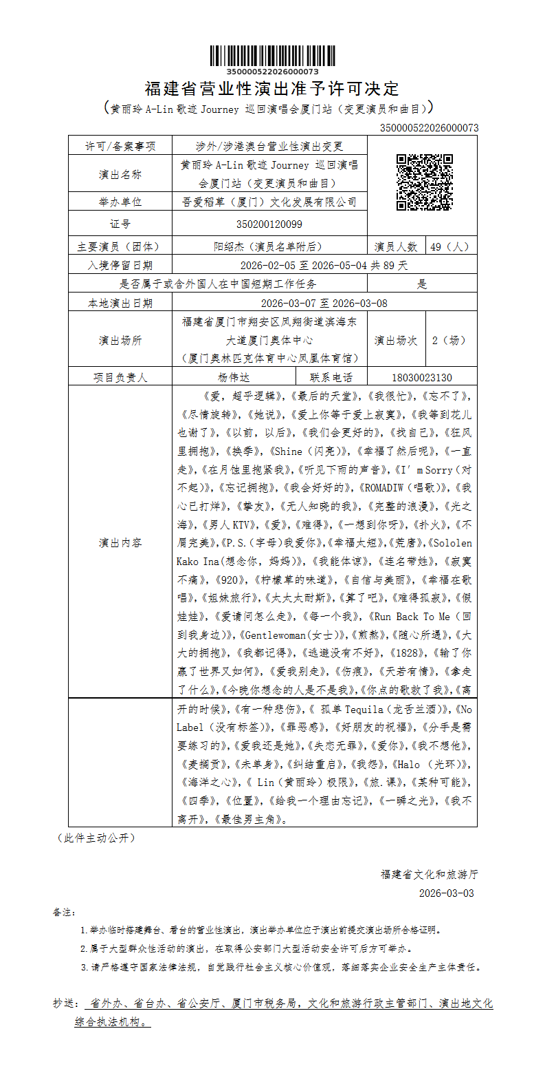 福建省营业性演出准予许可决定(黄丽玲A-Lin歌迹Journey 巡回演唱会厦门站(变更演员和曲目))