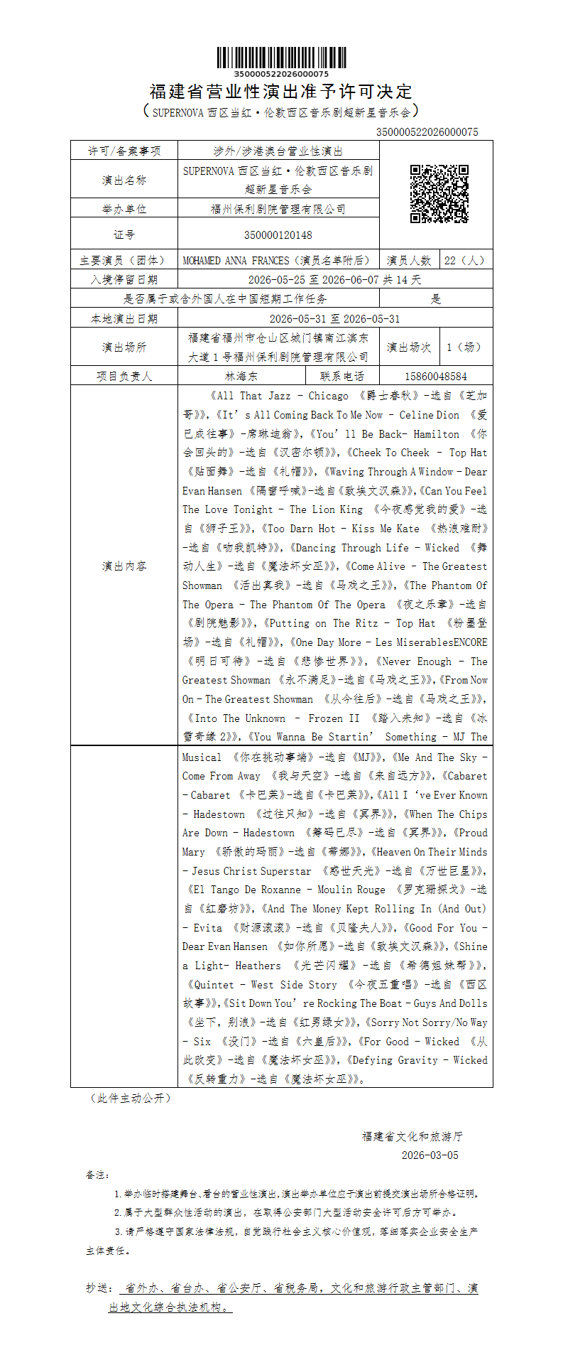 福建省营业性演出准予许可决定(SUPERNOVA西区当红·伦敦西区音乐剧超新星音乐会)