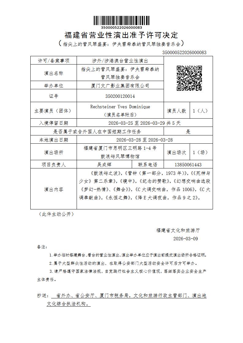 福建省营业性演出准予许可决定 (指尖上的管风琴盛宴:伊夫雷希泰纳管风琴独奏音乐会)