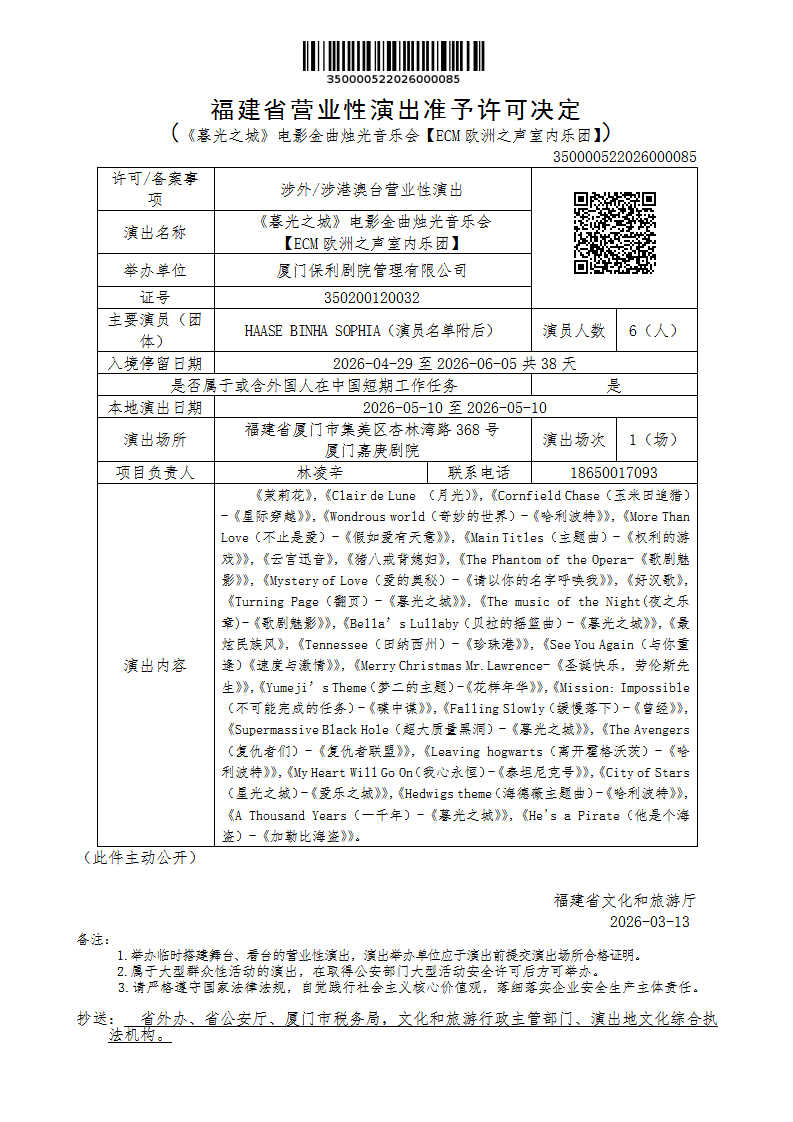 福建省营业性演出准予许可决定(《暮光之城》电影金曲烛光音乐会【ECM欧洲之声室内乐团】)