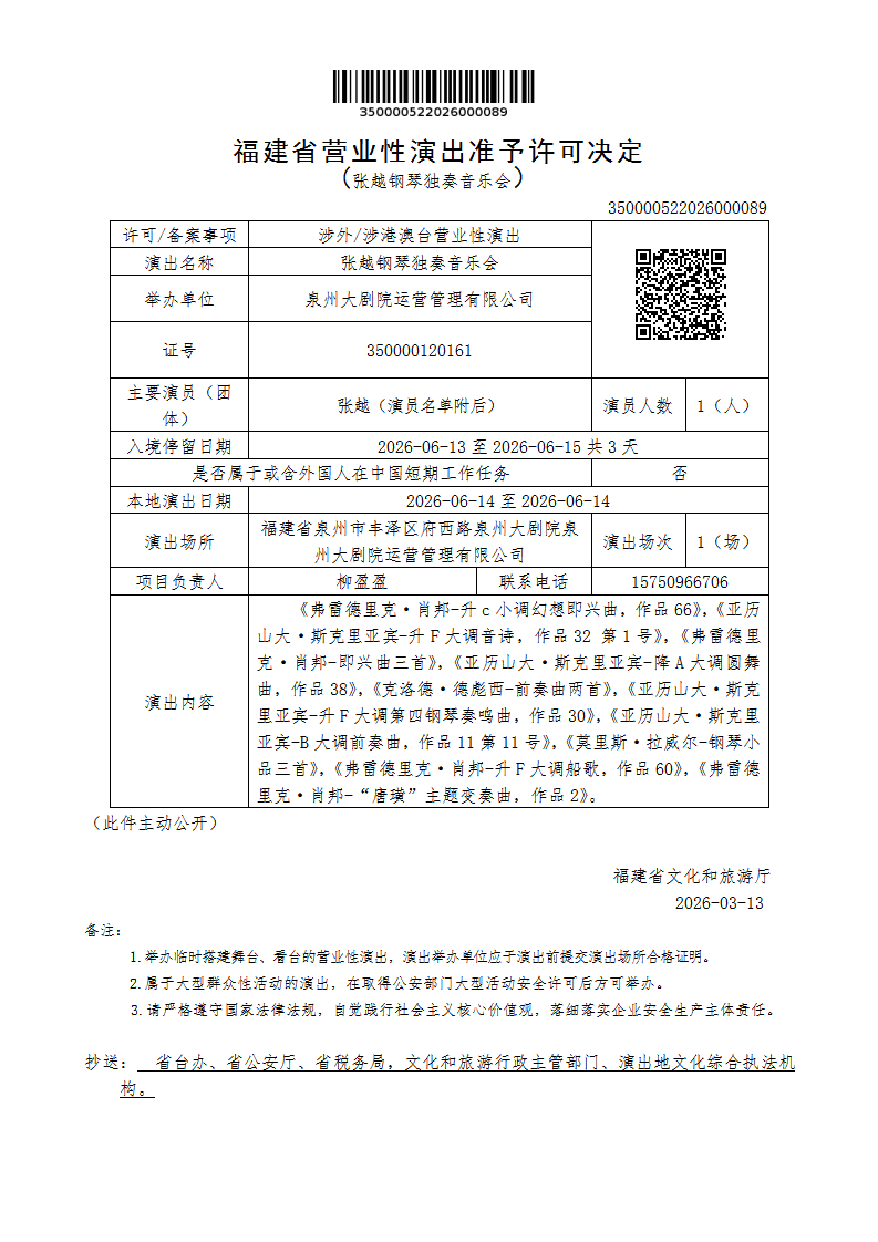 福建省营业性演出准予许可决定(张越钢琴独奏音乐会)