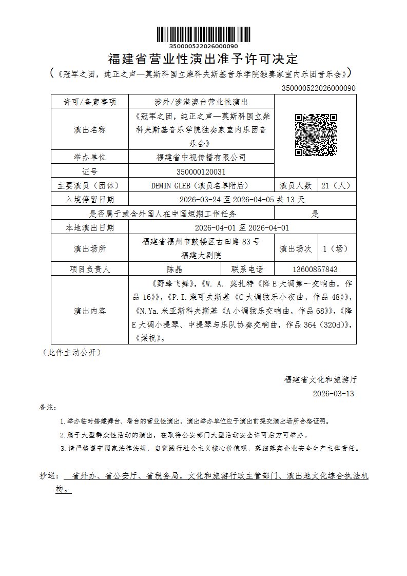 福建省营业性演出准予许可决定(《冠军之团,纯正之声—莫斯科国立柴科夫斯基音乐学院独奏家室内乐团音乐会》)