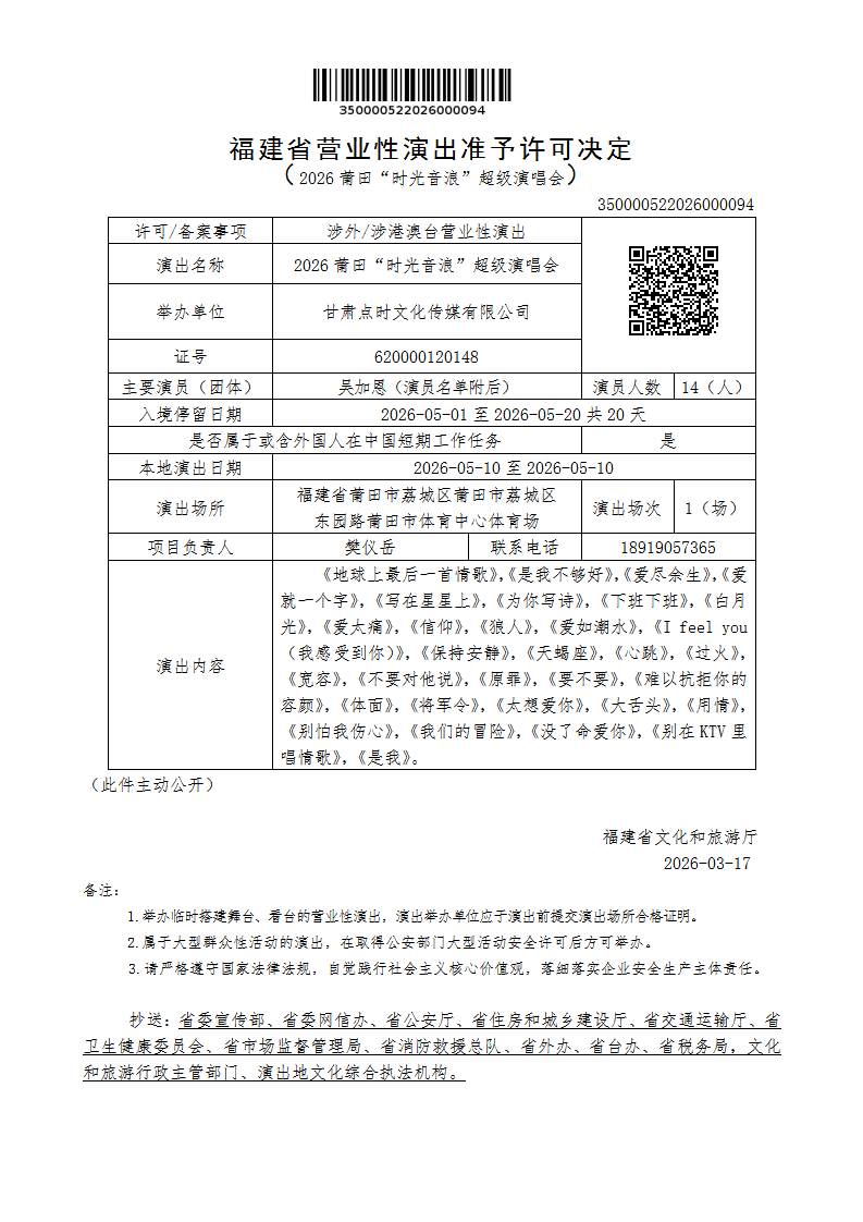 福建省营业性演出准予许可决定(2026莆田“时光音浪”超级演唱会)