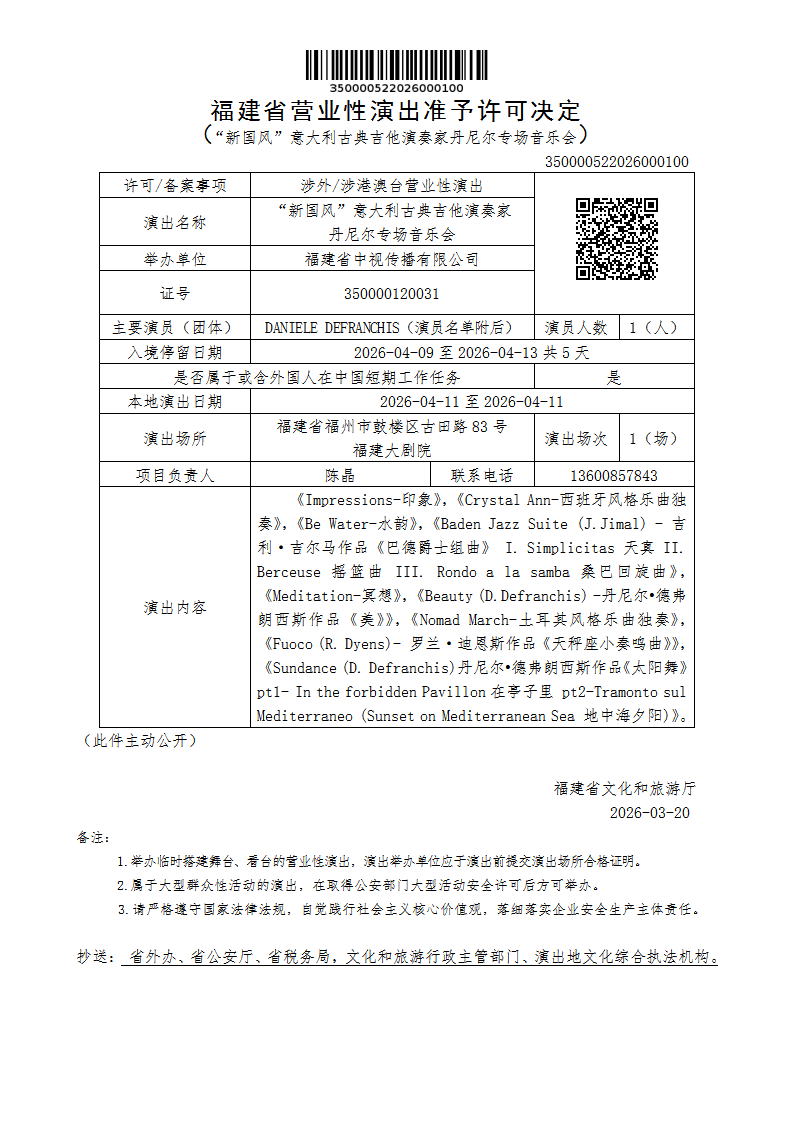 - 内容概述: 福建省营业性演出准予许可决定(“新国风”意大利古典吉他演奏家丹尼尔专场音乐会)