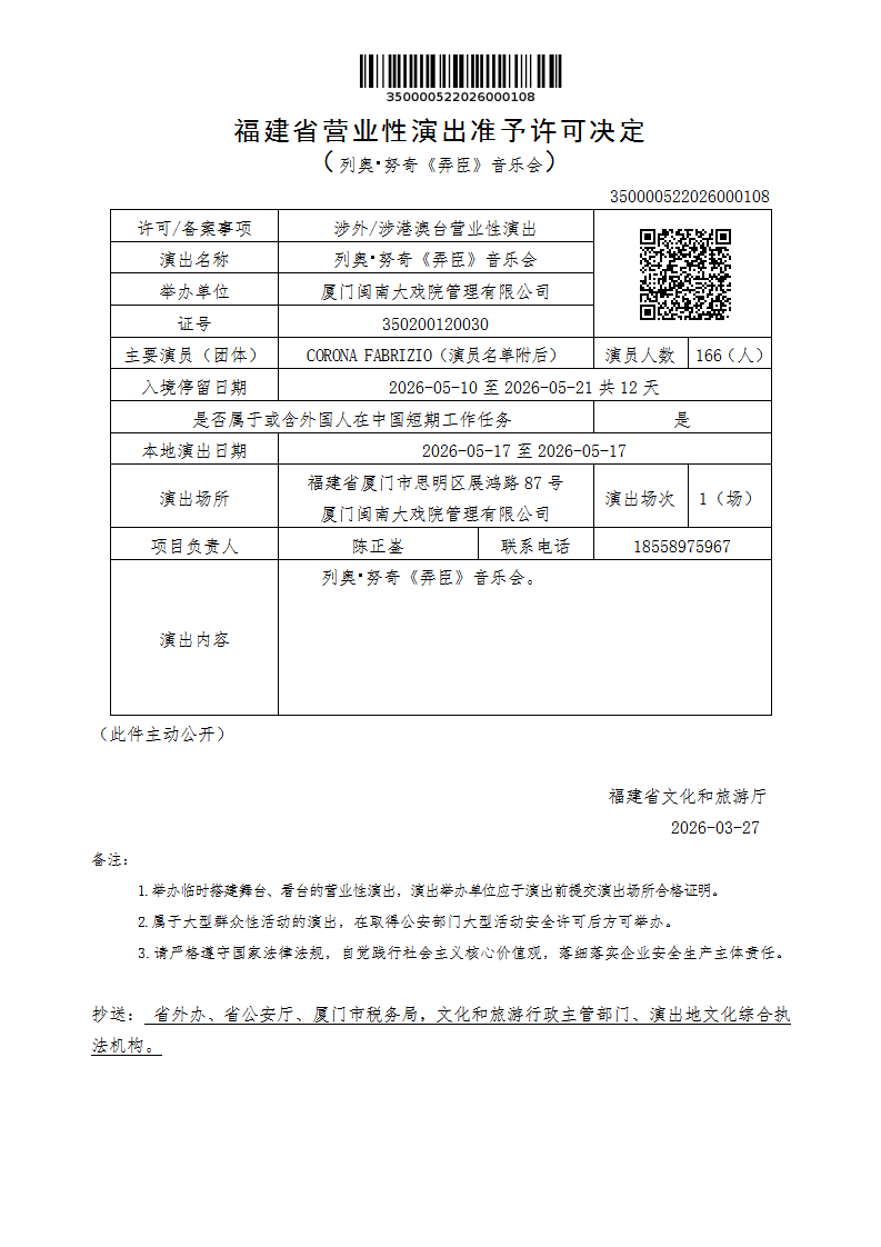 福建省营业性演出准予许可决定(列奥・努奇《弄臣》音乐会)