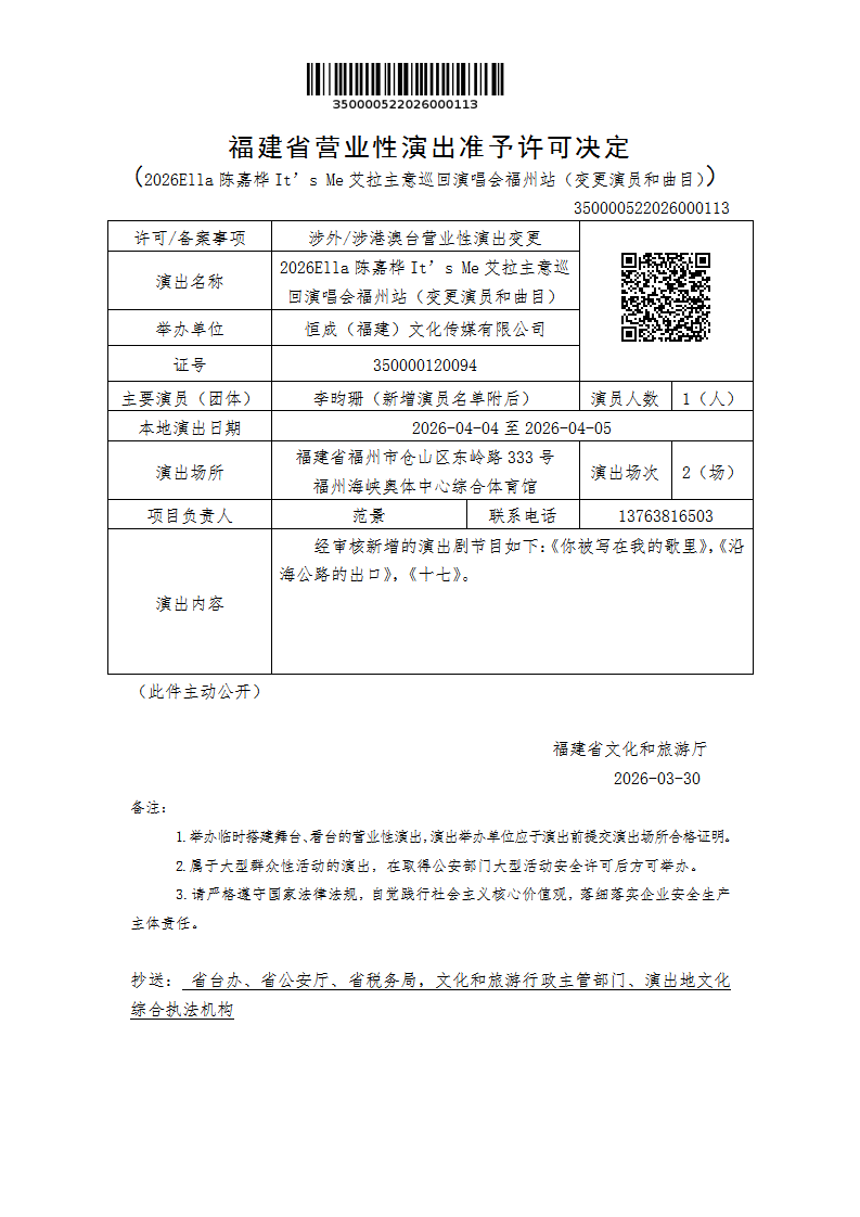- 内容概述: 福建省营业性演出准予许可决定(2026Ella陈嘉桦It’s Me艾拉主意巡回演唱会福州站(变更演员和曲目))