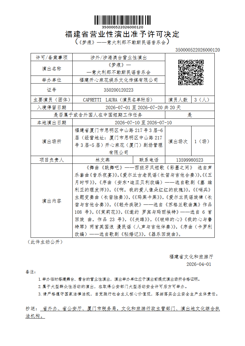 福建省营业性演出准予许可决定(《梦痕》——意大利那不勒斯民谣音乐会)