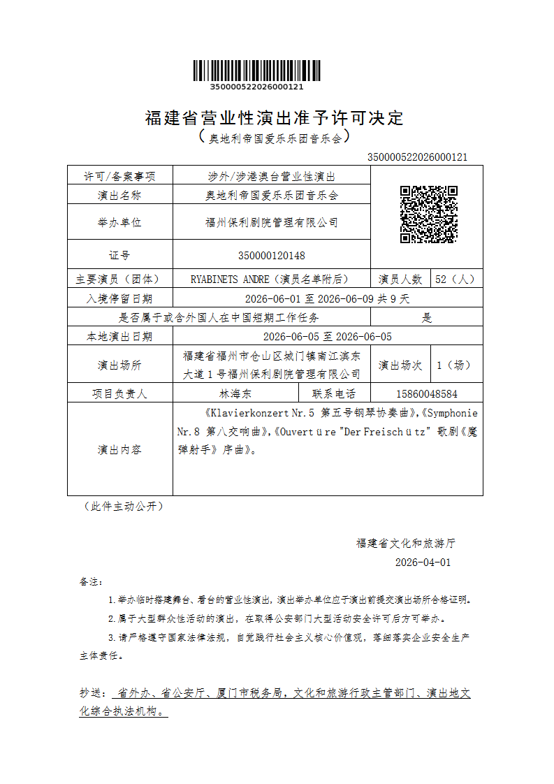 福建省营业性演出准予许可决定(奥地利帝国爱乐乐团音乐会)