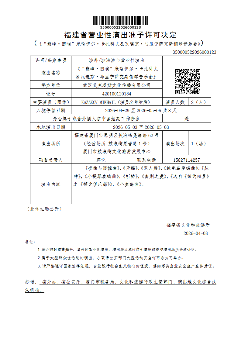 福建省营业性演出准予许可决定(《“巅峰·回响”米哈伊尔·卡扎科夫&瓦连京·马里宁萨克斯钢琴音乐会》)