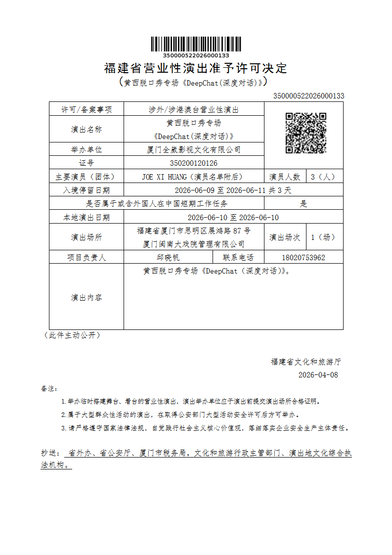 福建省营业性演出准予许可决定(黄西脱口秀专场《DeepChat(深度对话)》)
